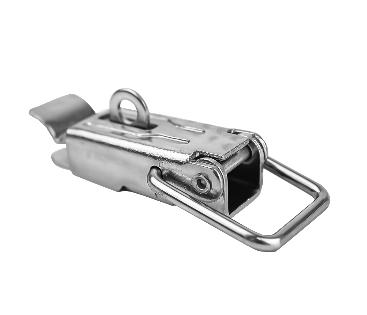 É acionado por uma trava com mola acoplada em um suporte por meio de um rebite permitindo a articulação de abrir e fechar.